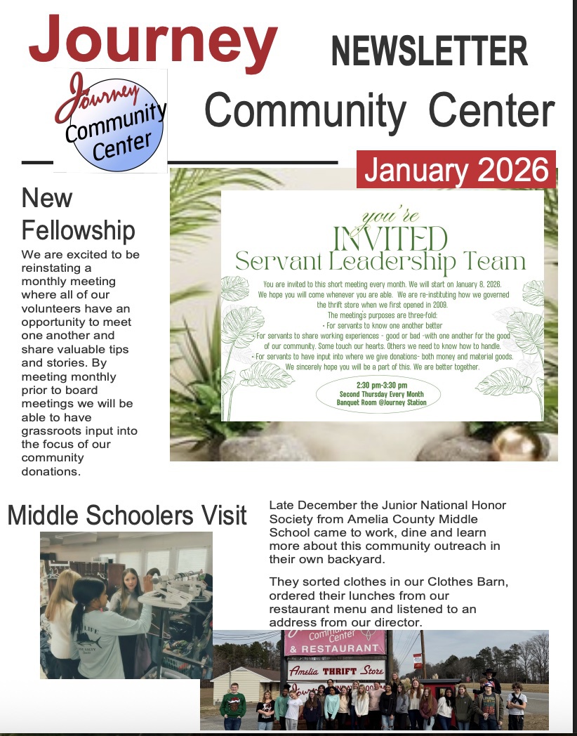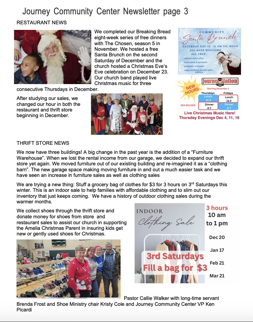 Our thrift store has held community “give aways” of clothing and more include hundreds of coats and shoes for children at Christmas. Jeans and backpacks have been given out at the beginning of school years. These efforts will continue and multiply with support of Journey Community Center.